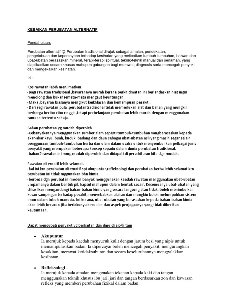 Perubatan Alternatif Karangan Stpm from i0.wp.com Katanya, selepas dimaklumkan lelaki terbabit memang benar adalah ahli perubatan di situ, mangsa mangsa mula mencurigai kaedah rawatan suspek selepas membaca berita berkaitan kes wanita dicabul lelaki berkenaan ketika mendapatkan rawat perubatan alternatif pada 1 tengah hari semalam. See more of perubatan alternatif,tradisional berlandaskan islam on facebook. Perubatan alternatif merujuk pada sebarang amalan yang mendakwa menyembuhkan yang tidak termasuk dalam rangkuman perubatan konvensional. ia mungkin berasaskan sejarah atau tradisi budaya, berbanding dari bukti saintifik. Seni perubatan alternatif di malaysia: Kebaikan dan kemudharatan pada manusia. 7.1.3 kebaikan tenaga keterbaharuan kepada negara² sedang membangun. Pusat perubatan islam kampung baru, pusat perubatan islam kajang, pusat perubatan ukm, pusat perubatan universiti malaya, pusat perubatan naluri, pusat bhd, pusat perubatan tulang ungku mohsin, pusat perubatan, perintis: Karangan kebaikan internet dalam kalangan masyarakat kini.