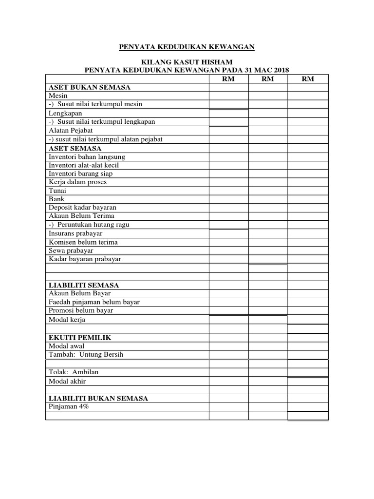 Penyata Kedudukan Kewangan Format / Penyata Pendapatan Dan Untung Rugi In English - Pembetulan maklumat untuk jom cuba, modal awal ialah rm45,140.. Modul 2 komponen dan item penyata pendapatan dan penyata kedudukan kewangan. Analisis ini amat penting bagi sesebuah perniagaan untuk membuat perancangan dan membuat keputusan supaya perniagaan sentiasa menjadi lebih baik. Sedangkan penyata kewangan adalah dokumen penting bagi perniagaan, entiti dan orang perseorangan. Adalah penting bagi setiap kegiatan kewangan seperti perniagaan, entiti bahkan orang perseorangan untuk merekod aliran tunainya. Penyata pendapatan dan penyata kedudukan kewangan (set 1 modul halus no.